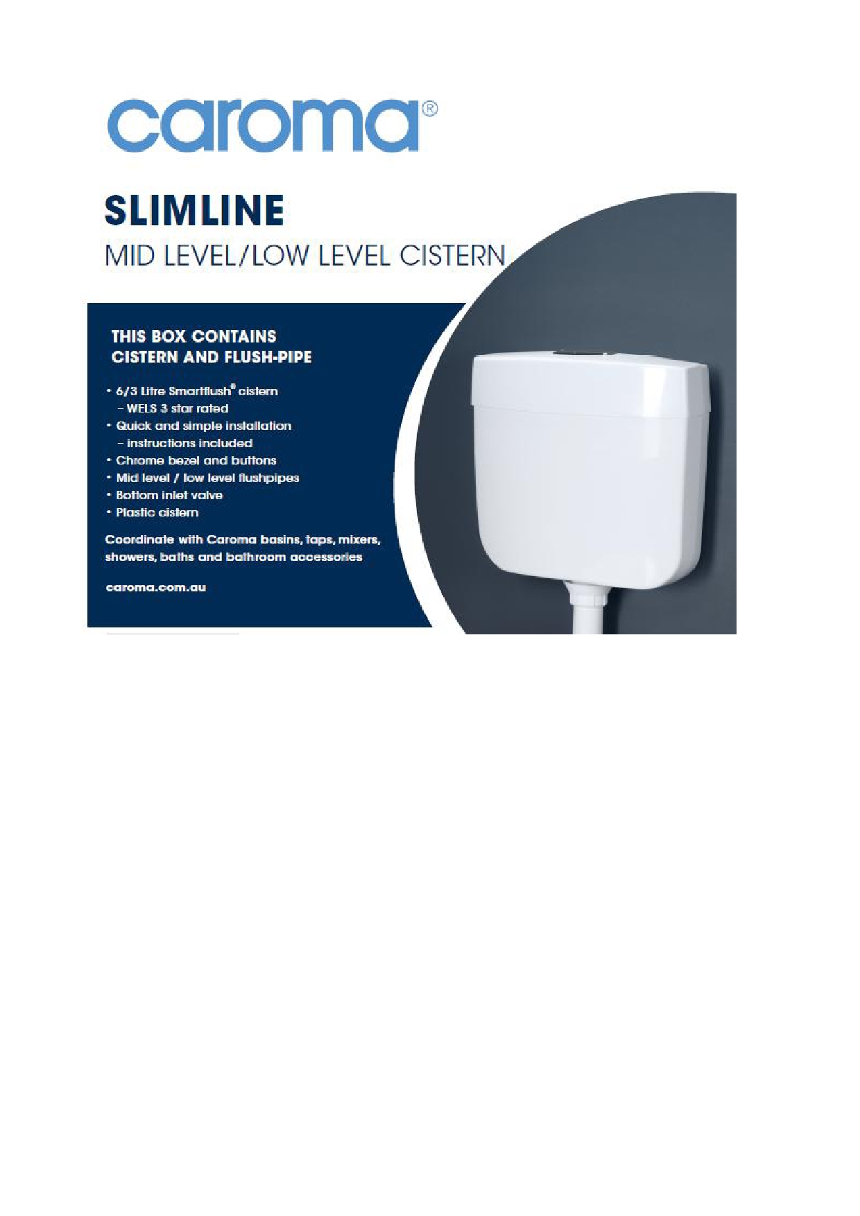 WELS 3 star rated, 6/3L Bottom inlet Plastic cistern with new updated lid design and chrome bezel andbuttons To achieve a WELS 3 star rating this cistern can be installed with a 6/3L or 4.5/3L connector pan Cistern and flush pipe only Adjustable to 9/4.5L