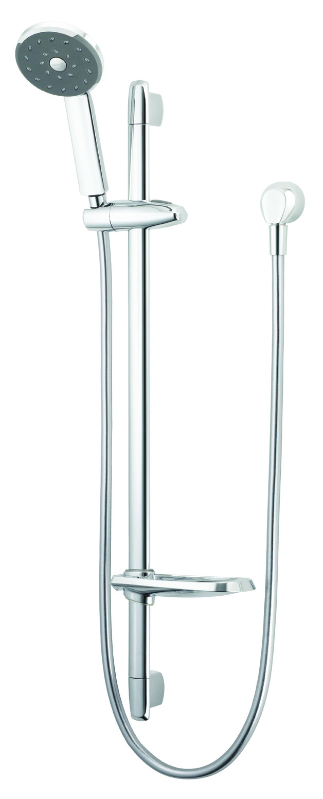 Features the revolutionary Satinjet® spray design. - Twin jets of water collide into thousands of tiny droplets to deliver voluminous shower coverage Single function handset featuring Satinjet® spray Easy to clean faceplate High quality 770mm elliptical rail with solid metal mounting points for extra durability Height adjustable, push button slider with reinforced metal handset holder Stylish chrome soap dish and Genesis brass wall elbow included Strong and durable SatinLux hose