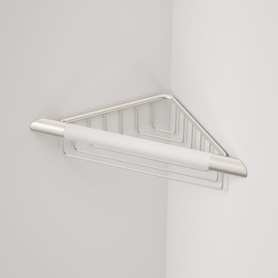 Caroma Opal Support Corner Shower Support Rail with Basket – Brushed Nickel/White